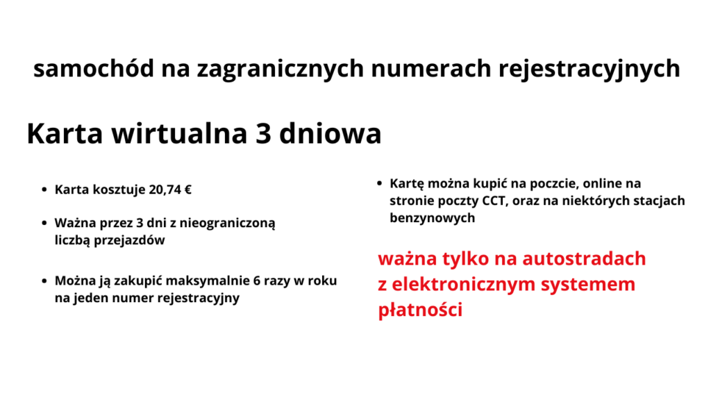 Bardzo ważne: 3 dniowa karta wirtualna służy tylko i wyłącznie do korzystania z autostrad z elektronicznym poborem opłat, posiadając ten system, nadal trzeba się zatrzymywać na autostradach, gdzie występuje biletowy pobór opłat.