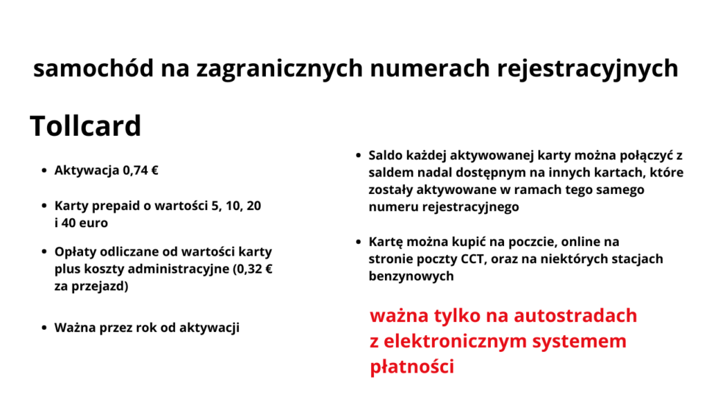 Tollcard – karta połączona z waszym numerem rejestracyjnym. Można zakupić kartę o wartości 5, 10, 20 lub 40 euro. Rejestracji dokonuje się za pomocą SMS-a. Karta jest ważna rok od rejestracji a środki z karty nie podlegają zwrotowi.