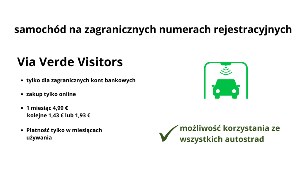 Bardzo ważne: z Via Verde Visitors, można korzystać ze wszystkich portugalskich autostrad, nie trzeba się zatrzymywać na bramkach, można przejeżdżać pasami wyznaczonymi dla ViaVerde, a opłata będzie pobierana automatycznie z naszego konta.
