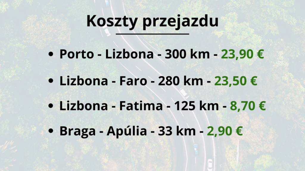 Poniższa grafika przedstawia przykładowe koszty za przejazdy portugalskimi autostradami: