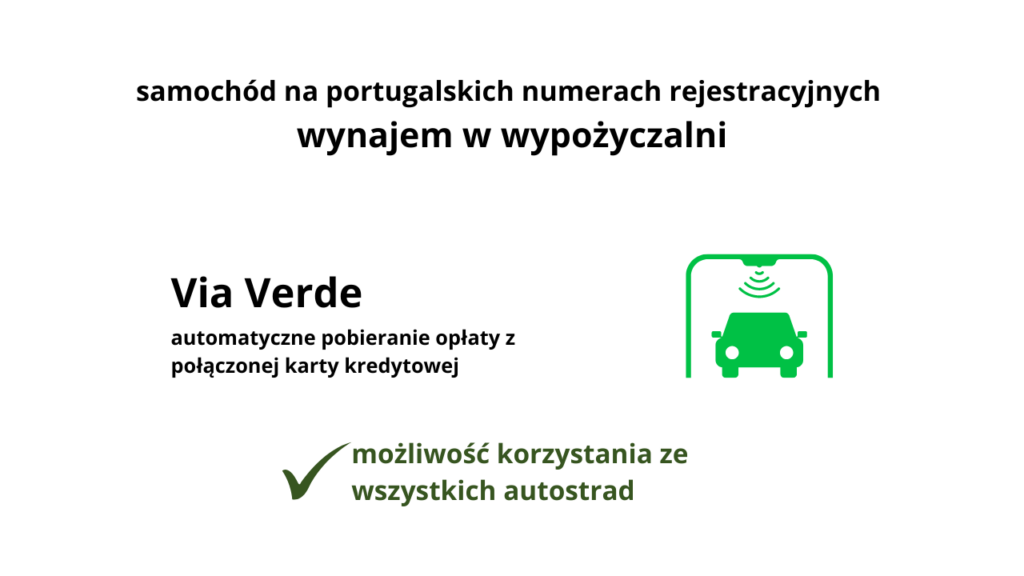 W 2023 roku, w Portugalii zmieniło się prawo i w weszła w życie ustawa, która nakłada na firmy zajmujące się wynajmem, obowiązek zamontowania we wszystkich swoich pojazdach identyfikatora Via Verde. Przy wynajmowaniu auta w Portugalii, w cenie wynajmu powinna być już cena za użytkowanie identyfikatora (ok. 2 euro za dzień, w zależności od wypożyczalni) Karta kredytowa wypożyczającego jest powiązana z urządzeniem i opłata jest pobierana automatycznie. Jeżeli nie będziecie używać autostrad to koszty „wypożyczenia tego urządzenia” powinny wam zostać zwrócone.